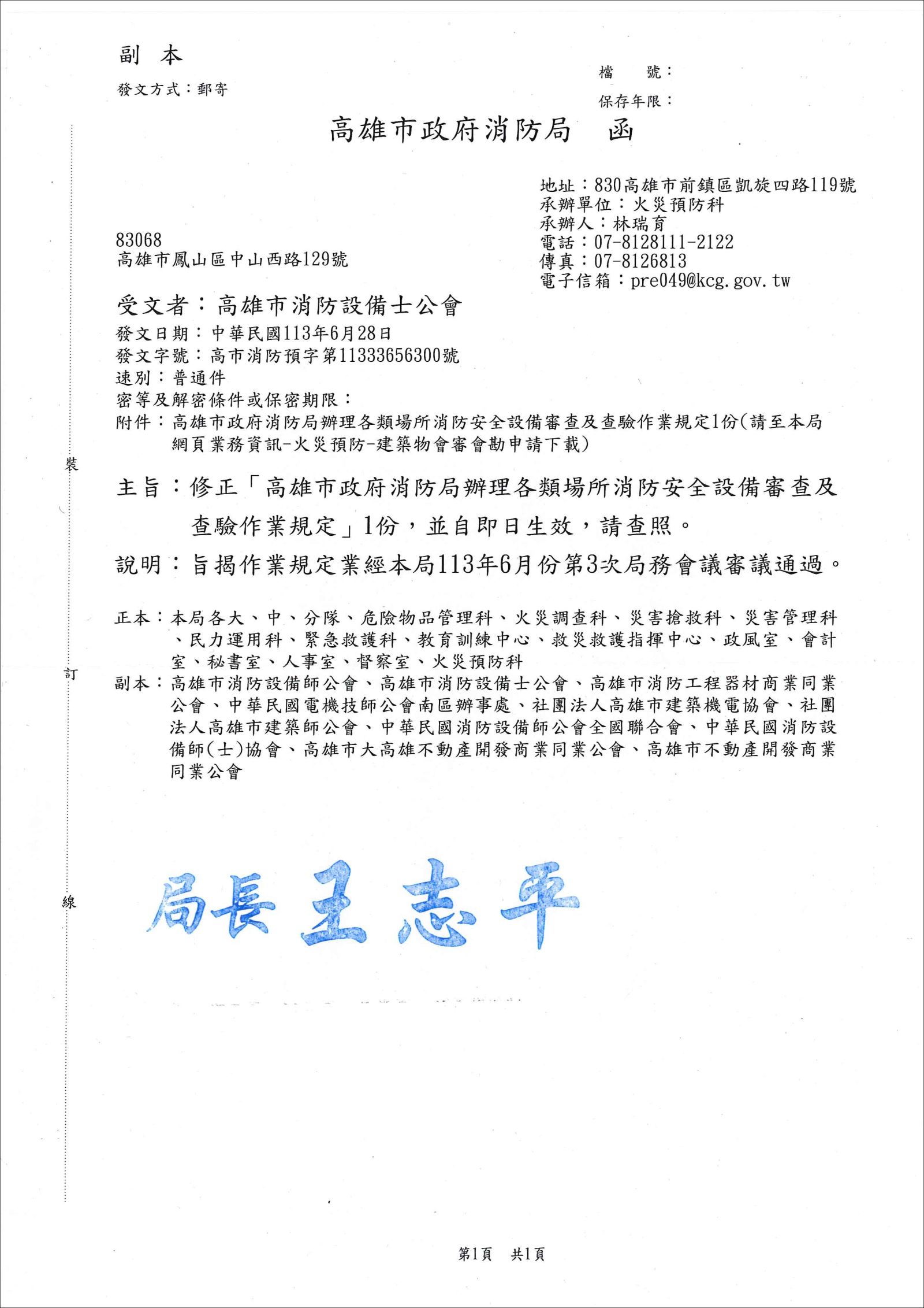 修正「高雄市政府消防局辦理各類場所消防安全設備審查及查驗作業規定」乙份,並自即日起生效。