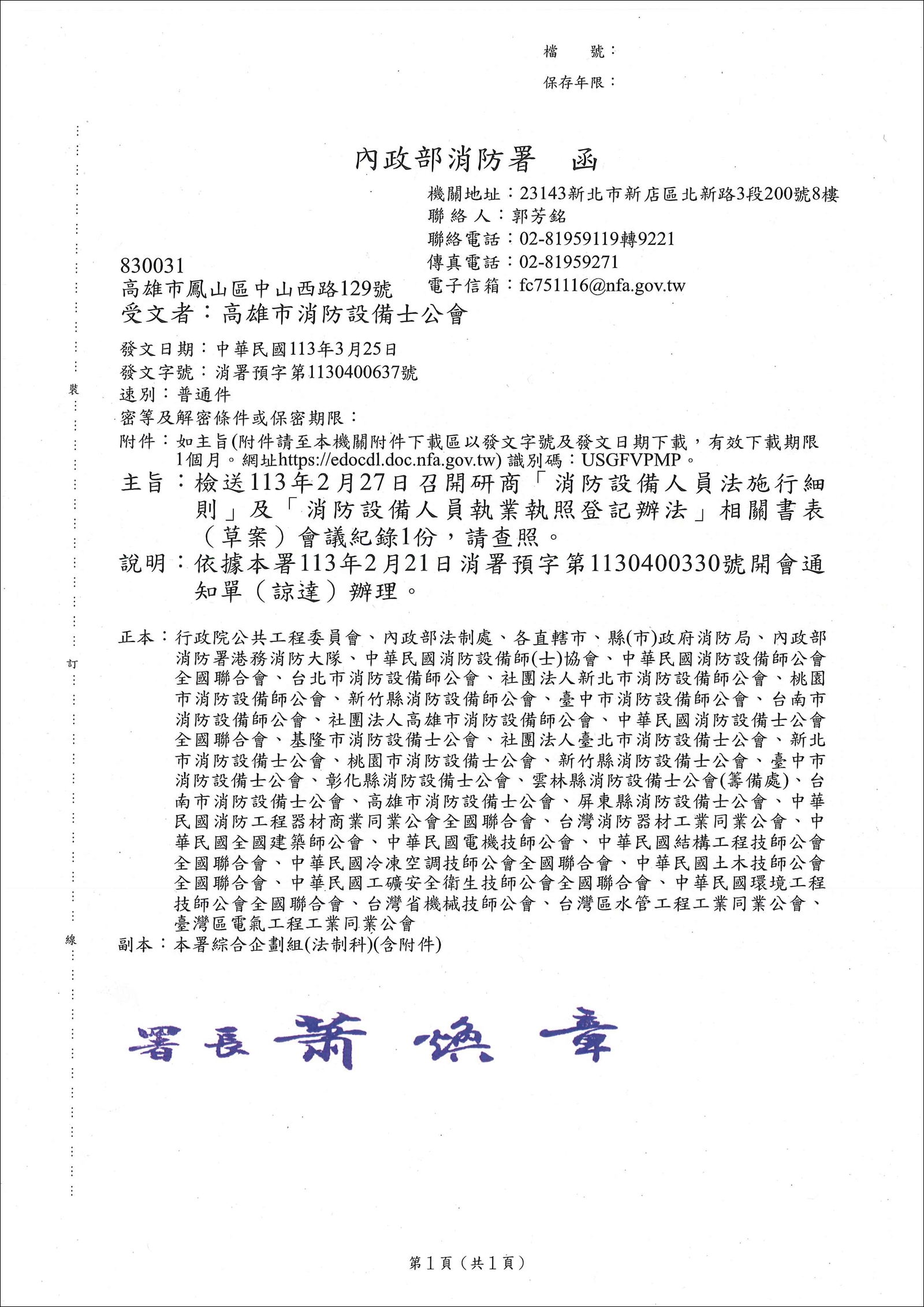 檢送113年2月27日召開研商「消防設備人員法施行細則」及「消防設備人員執業執照登記辦法」相關書表(草案)會議記錄1份,請查照。