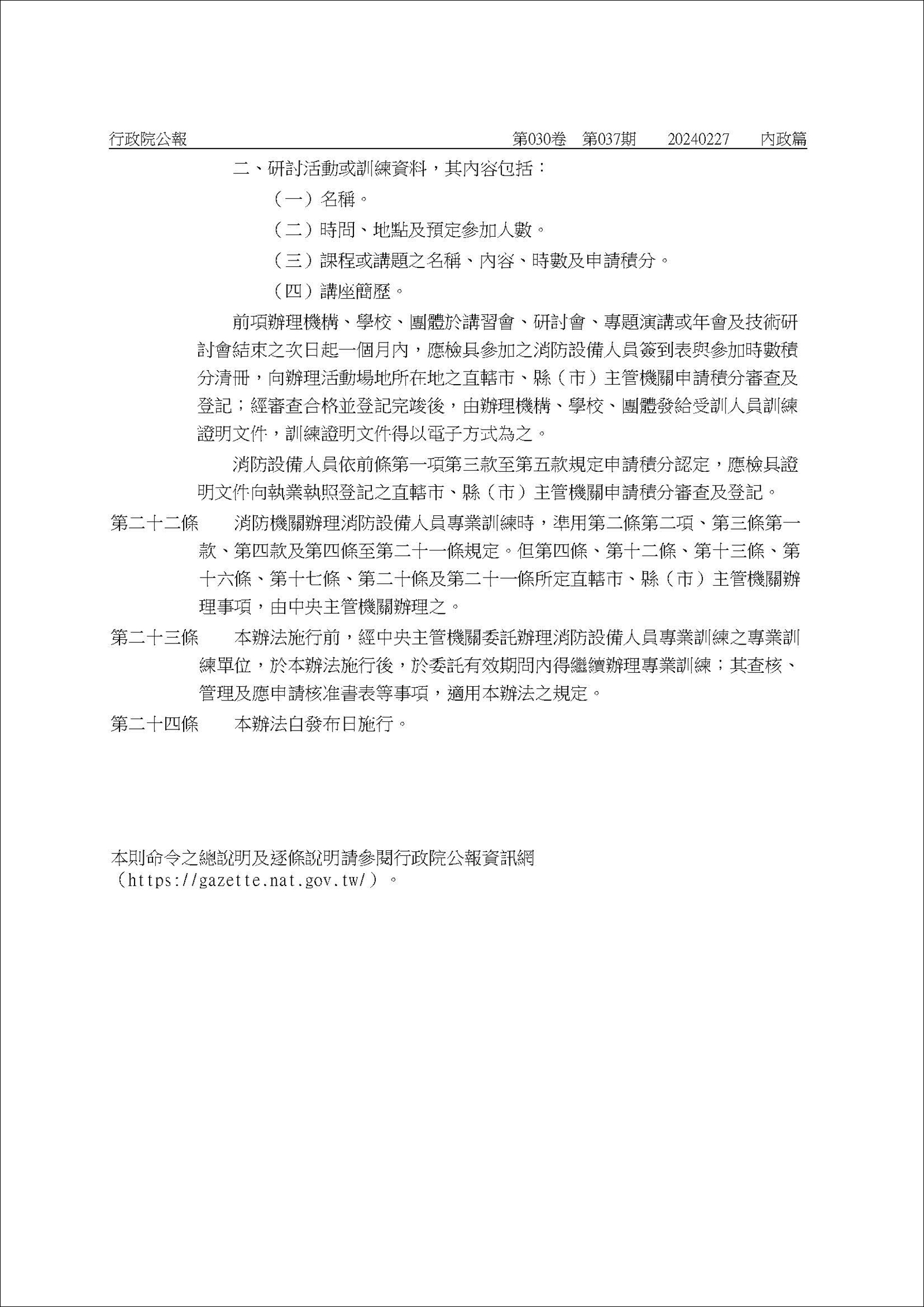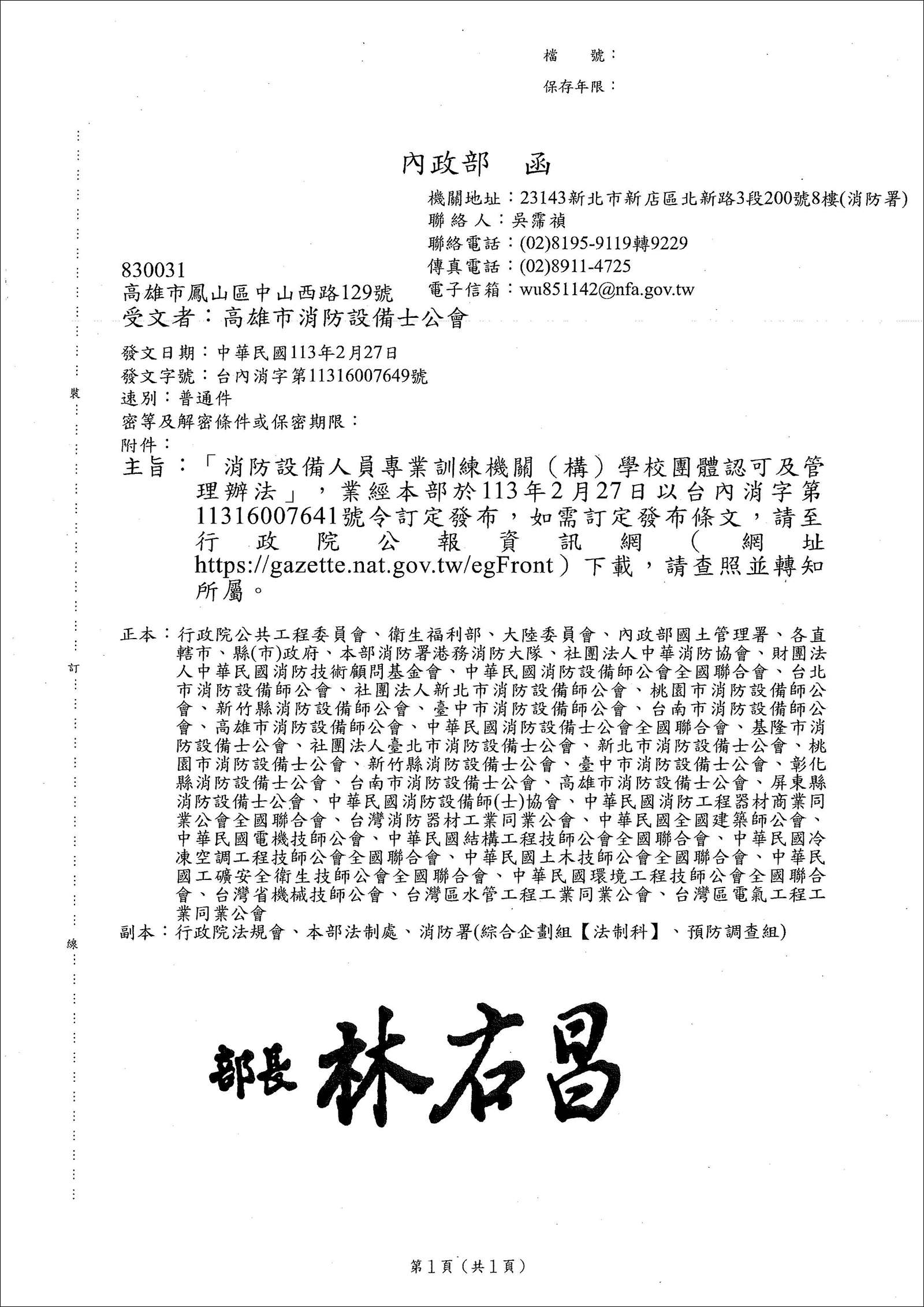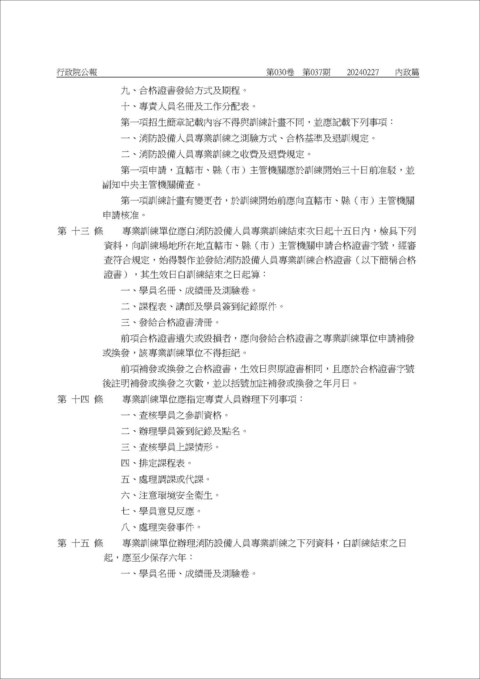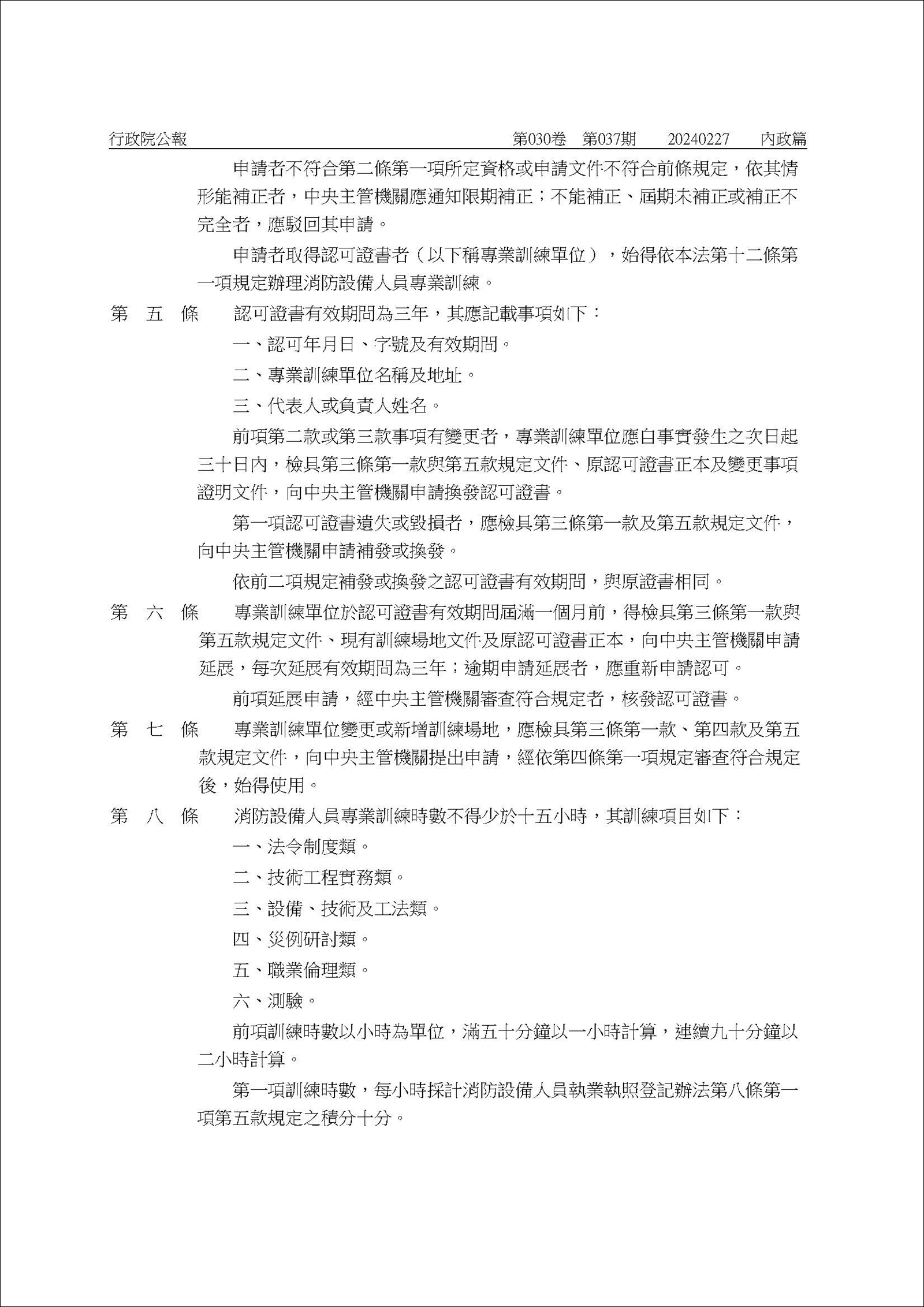 訂定發布條文:「消防設備人員專業訓練機關(構)學校團體申請認可及管理辦法」