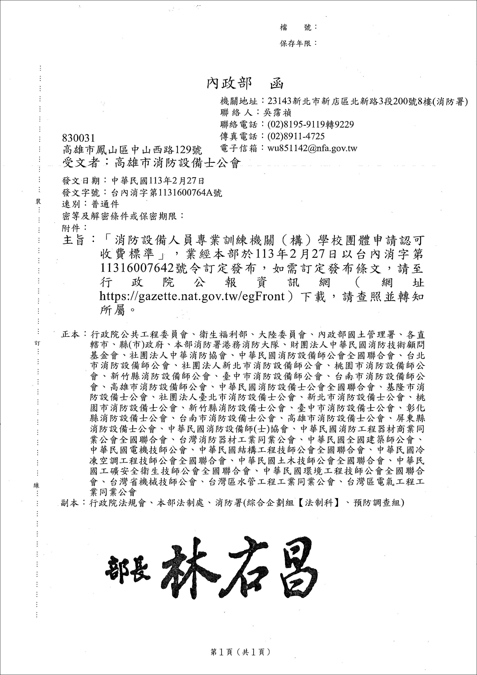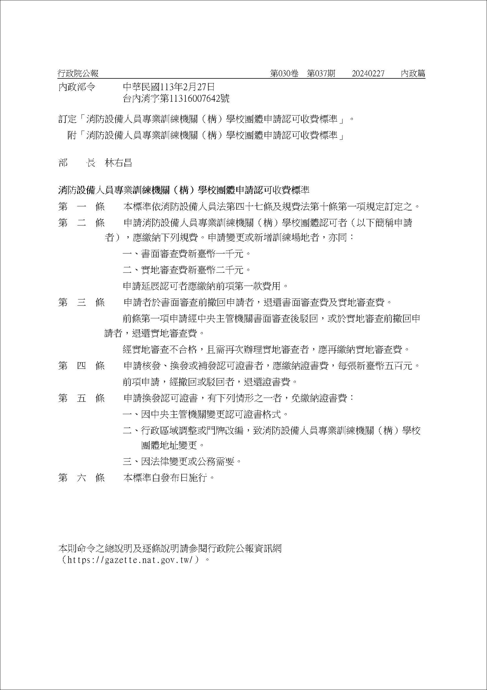 訂定發布條文:「消防設備人員專業訓練機關(構)學校團體申請認可收費標準」