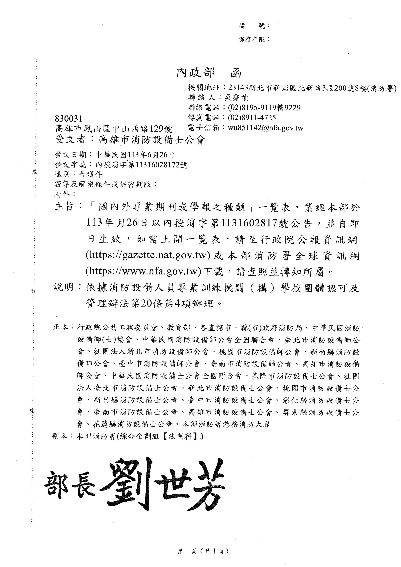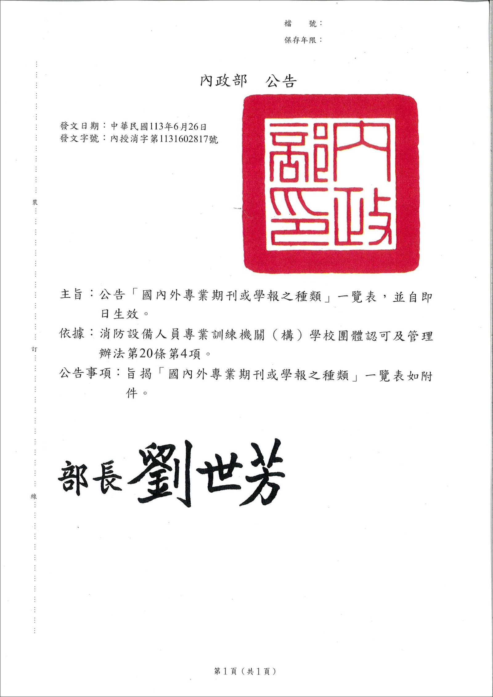 「國內外專業期刊或學報之種類」一覽表,業經內政部於113年6月26日以內受消字第1131602817號公告,並自即日生效。
