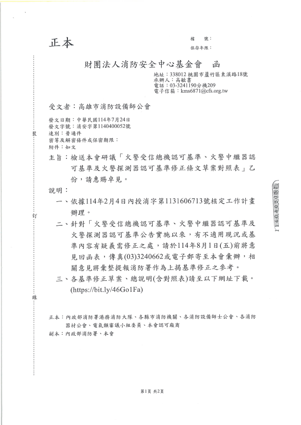 財團法人消防安全中心基金會-檢送本會研議「火警受信總機認可基準、火警中繼器認可基準及火警探測器認可基準修正修文草案對照表」乙份,請惠賜卓見。