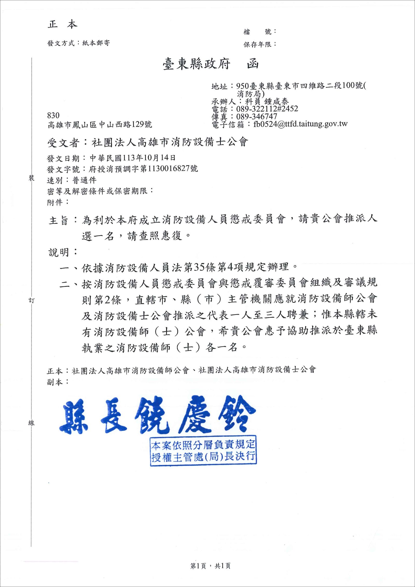 臺東縣政府為成立消防設備人員懲戒委員會,請本公會推派人選一名。