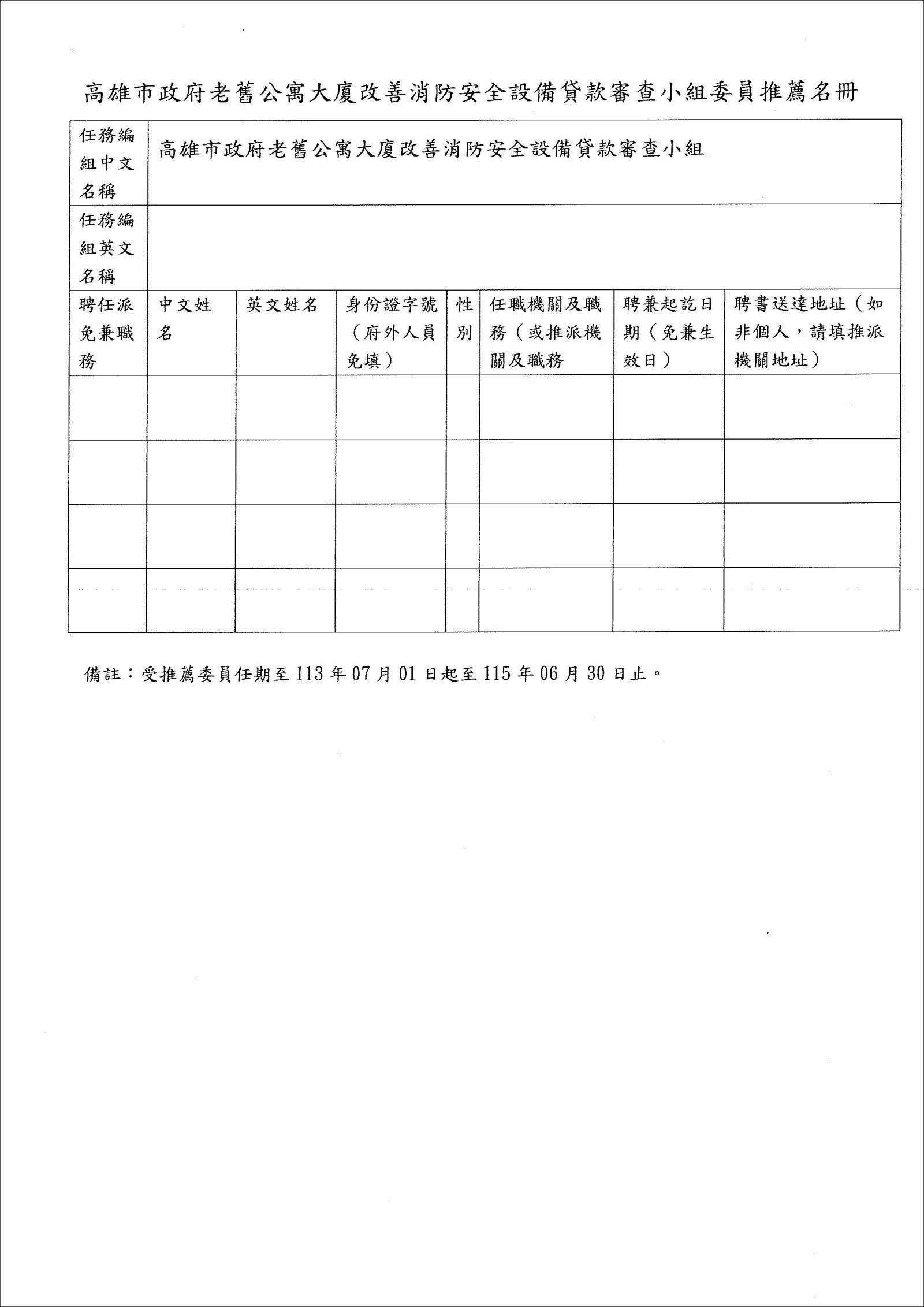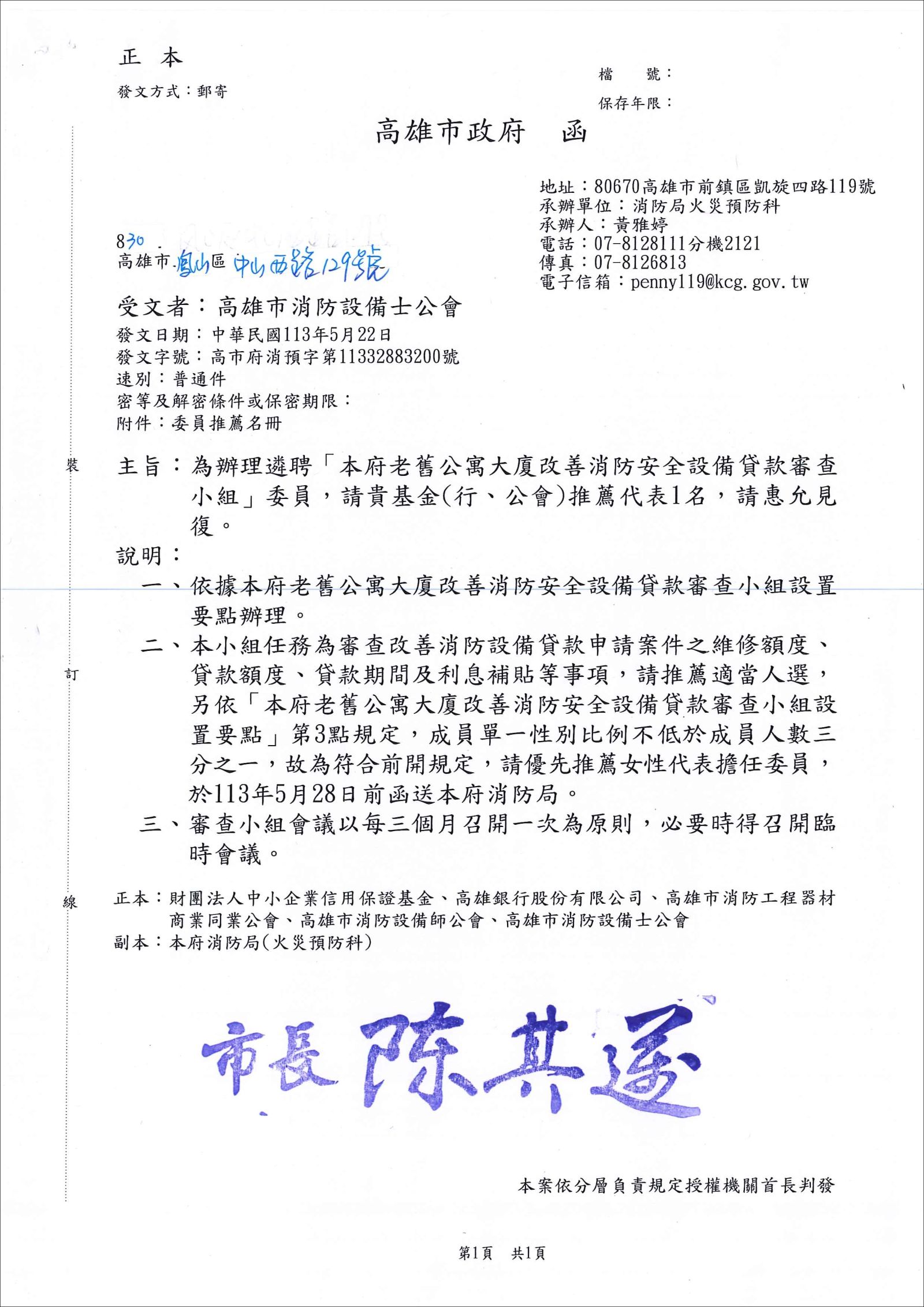 高雄市政府為辦理遴選「本府老舊公寓大廈改善消防安全設備貸款審查小組」委員,請本公會推薦代表一名。