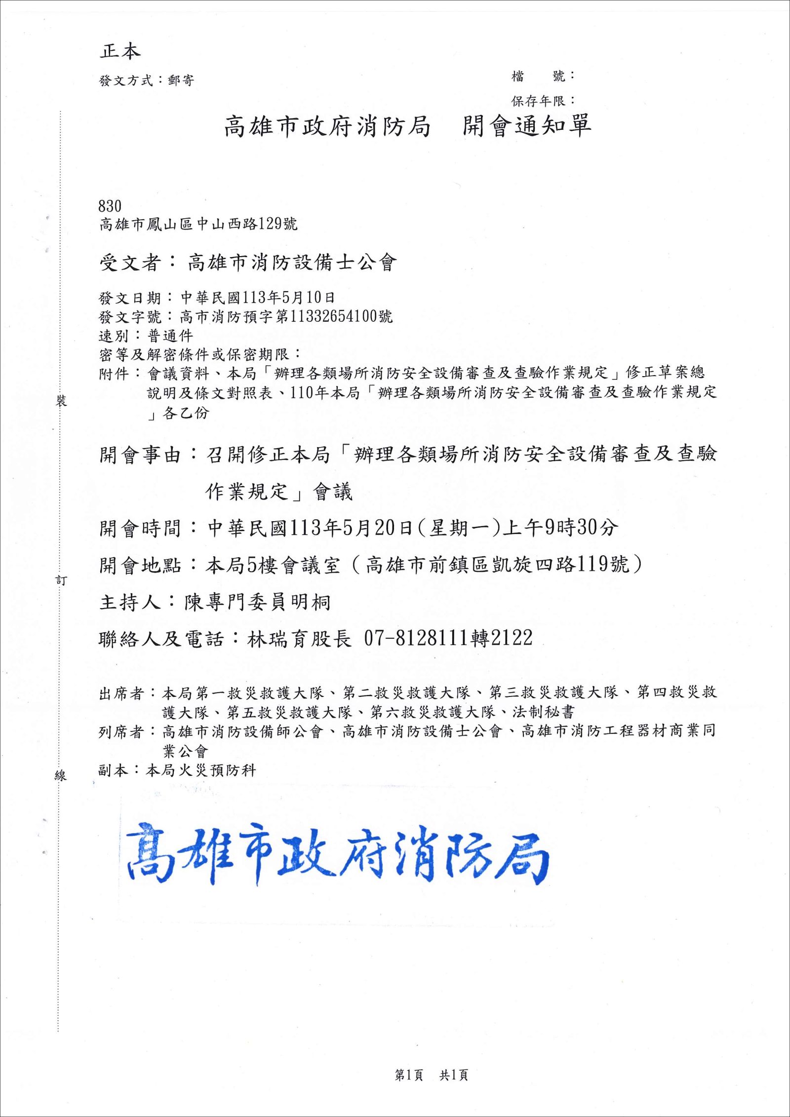 召開修正本局「辦理各類場所消防安全設備審查及查驗作業規定」會議 開會通知單。